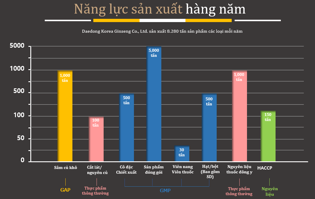 Bên cạnh đó, thương hiệu cũng không ngừng nâng cao quy trình sản xuất, trang thiết bị và nhân lực để tối ưu hoá lợi thế của hồng sâm cũng như các chế phẩm từ nhâm sâm. Trong hơn 20 năm qua, Daedong đã đạt nhiều tiêu chuẩn quốc tế như GMP, ISO22000, HACCP,…
