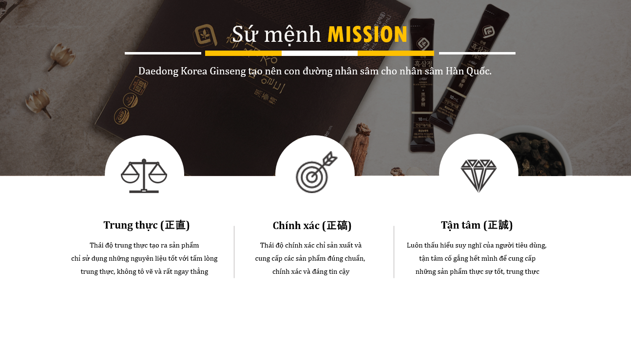 Trung thực – Chính xác – Chân thành kết hợp với sự sáng tạo và đổi mới chính là bí quyết giúp thương hiệu Daedong Korea Ginseng phát triển không ngừng. Với vai trò là thương hiệu hồng sâm được chính phủ Hàn Quốc bảo trợ, đồng thời cũng nằm trong TOP 3 thương hiệu nhân sâm tốt nhất tại Hàn Quốc. Chúng tôi với hơn 20 năm phát triển và ra đời với mục tiêu quản lý chất lượng nguồn nhân sâm quốc gia, Daedong Korea Ginseng là một trong những thương hiệu đi đầu trong việc nghiên cứu các lợi ích của hồng sâm đối với sức khỏe, cũng như phát triển đa dạng các dòng sản phẩm phù hợp với mọi lứa tuổi người dùng.